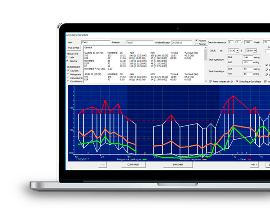 The MAPA Holter Blood Pressure Monitor provides accurate ambulatory measurements while maximising patient comfort. Its adaptable, tubeless cuff makes it easy to wear on a daily basis and reduces the discomfort usually associated with conventional devices. The night-time setting allows the frequency or intensity of measurements to be reduced during sleep in order to limit interruptions. The built-in battery ensures continuous use throughout the protocol, without additional handling. The data is then analysed using dedicated software, allowing clear interpretation of the day/night blood pressure profile for a reliable and comprehensive ambulatory assessment.