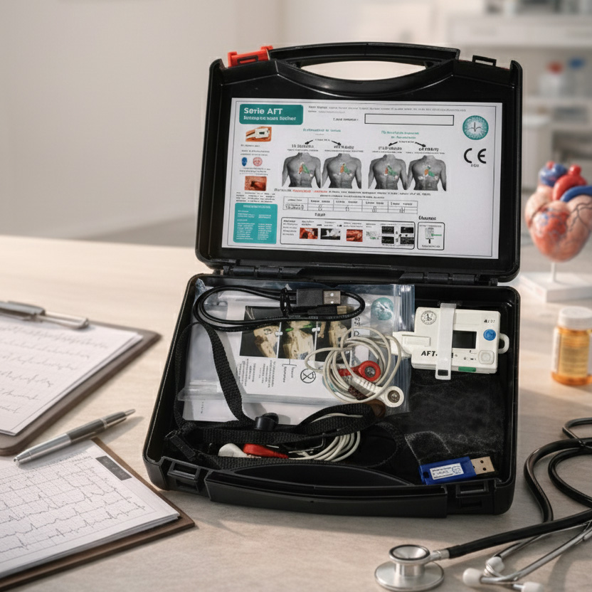 • Kit de démarrage : avec une mallette + 1 enregistreur AFT1000+a + 1 câble ECG + 100 pochettes de protection + 10 tours du cou+ + câble USB + Abonnement 1 an Quick Reader /dongle + Guide